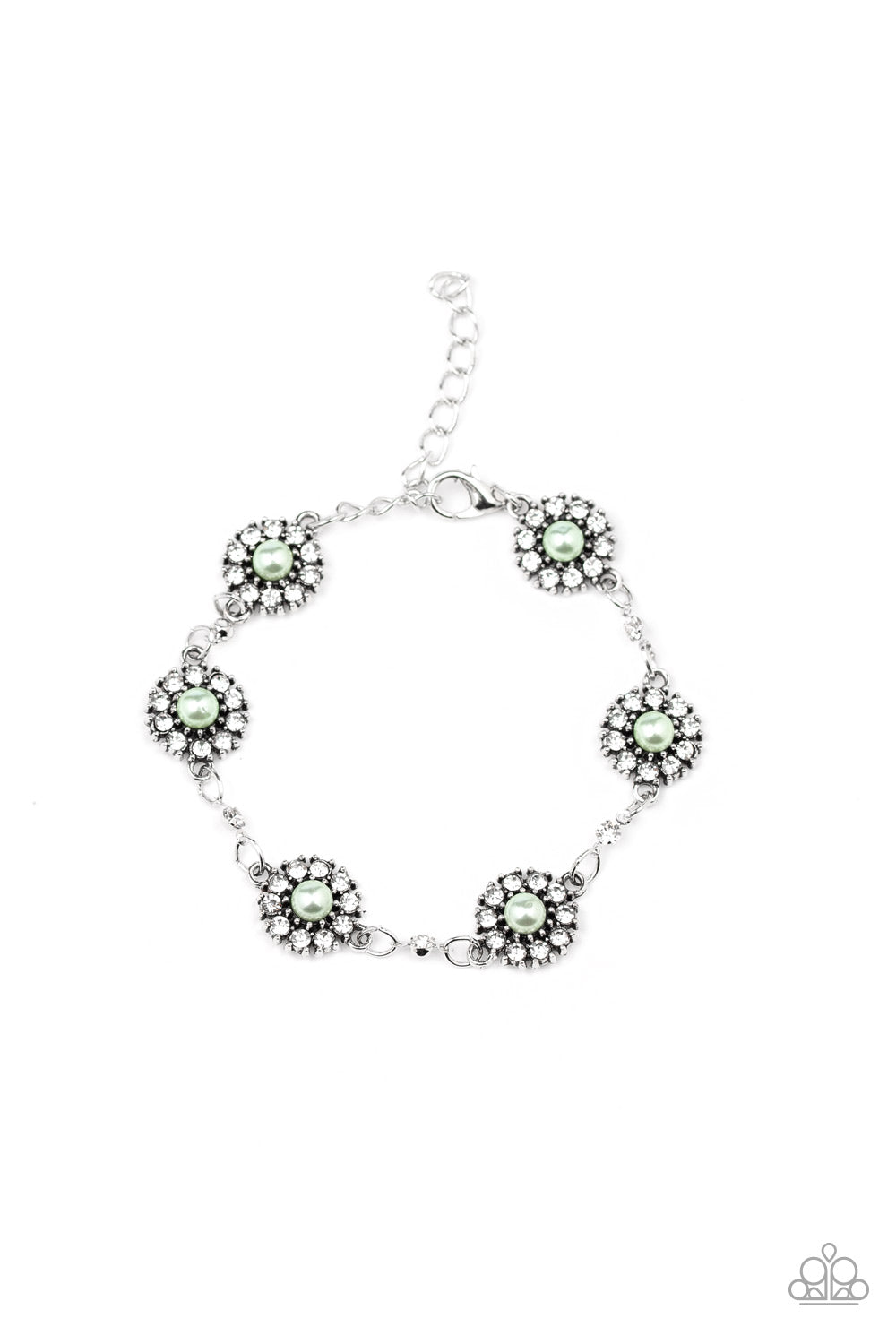 Dotted in dainty green pearl centers, white rhinestone encrusted silver floral frames delicately link around the wrist for a whimsical look. Features an adjustable clasp closure.